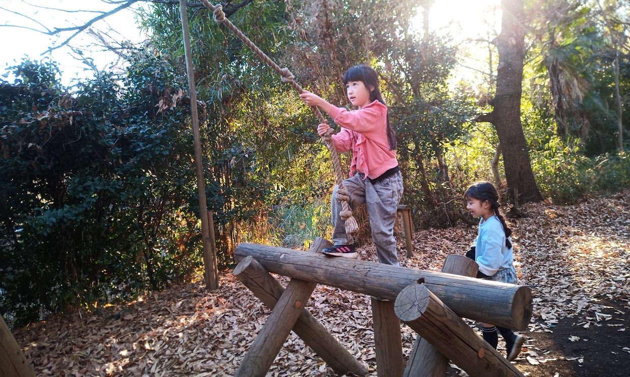 毎年冬はなぜかフィールドアスレチックに遠足をしています。場所はいつも同じ「フィールドアスレチック横浜つくし野コース」。小2~中3の30名ほどで訪れました。写真の二人は小学2年生、身のこなしの軽やかさは羨ましい限りです。スタッフは歩いて回るだけでも疲れ、池に落ちてずぶ濡れにもなりました…。(2026.1月)